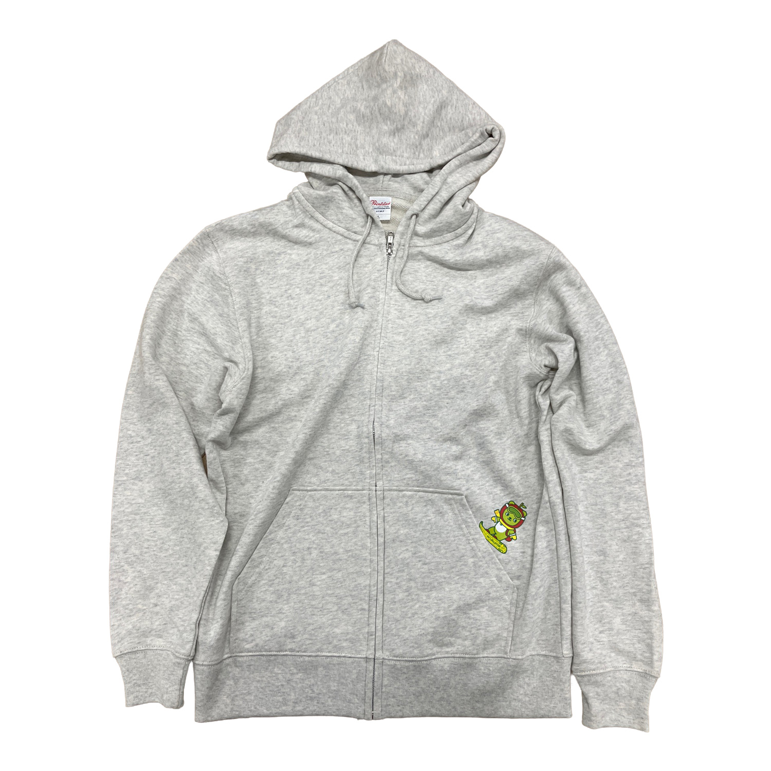 パーカーのポケット部分を雪山の斜面に見立て、アルクマがボードで颯爽と滑りおりる姿をワンポイントで仕上げました。
