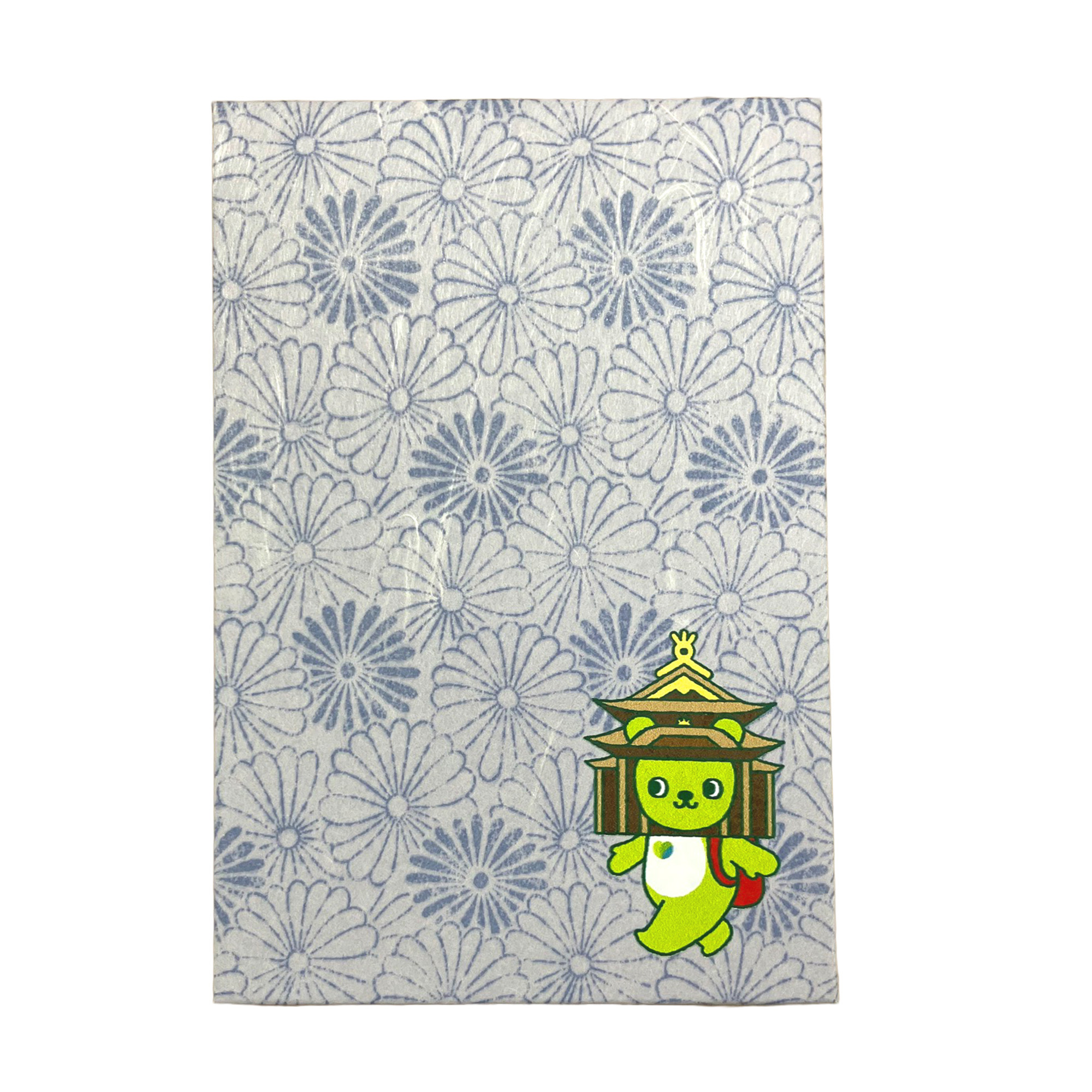 落ち着いた青の菊の花柄をベースに、アルクマがちょこんと寄り添う上品でエレガントな仕上がり。